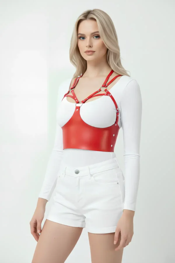Göğüs Detaylı Deri Kırmız Harness Büstiyer, Şık Deri Korse – APFT872